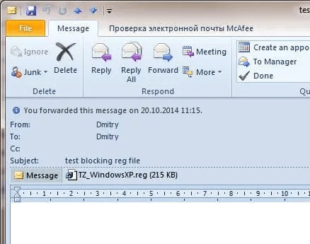 При получении письма с подобными вложениями Outlook автоматически блокирует их, выводя сообщение:
