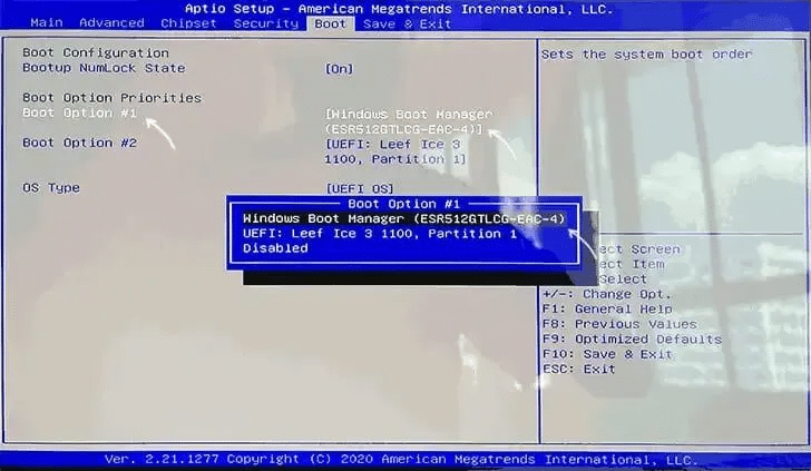 Проблема также может быть вызвана некорректным приоритетом загрузки. В BIOS/UEFI убедитесь, что первым устройством загрузки (Boot Option 1) выставлено устройство с установленной ОС: