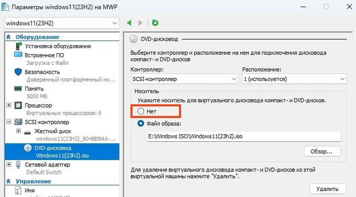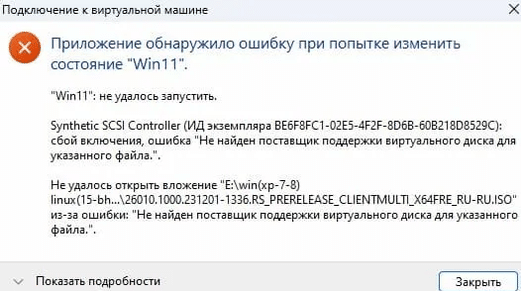Ошибка «Не найден поставщик поддержки виртуального диска для указанного файла» обычно появляется, когда в настройках виртуальной машины указан некорректный загрузочный носитель, и чаще всего это связано с тем, что виртуальная машина пытается загрузиться с ненужного ISO-образа, который уже не требуется для работы. Для решения проблемы необходимо удалить ISO-образ из списка загрузки в настройках Hyper-V.