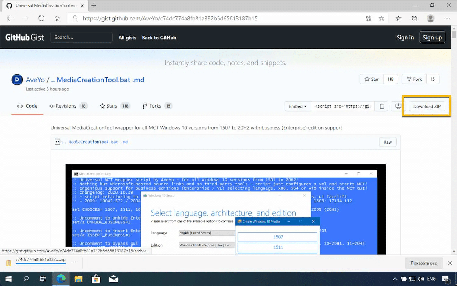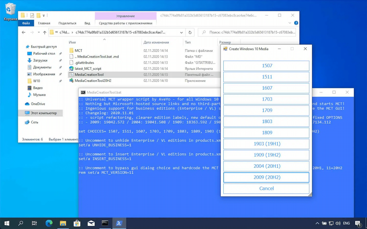 Для скачивания любой версии Windows 10, включая более ранние сборки, можно использовать сторонний пакетный файл MediaCreationTool.bat. Этот скрипт работает в связке с Media Creation Tool и позволяет выбирать конкретную версию ОС перед её загрузкой.