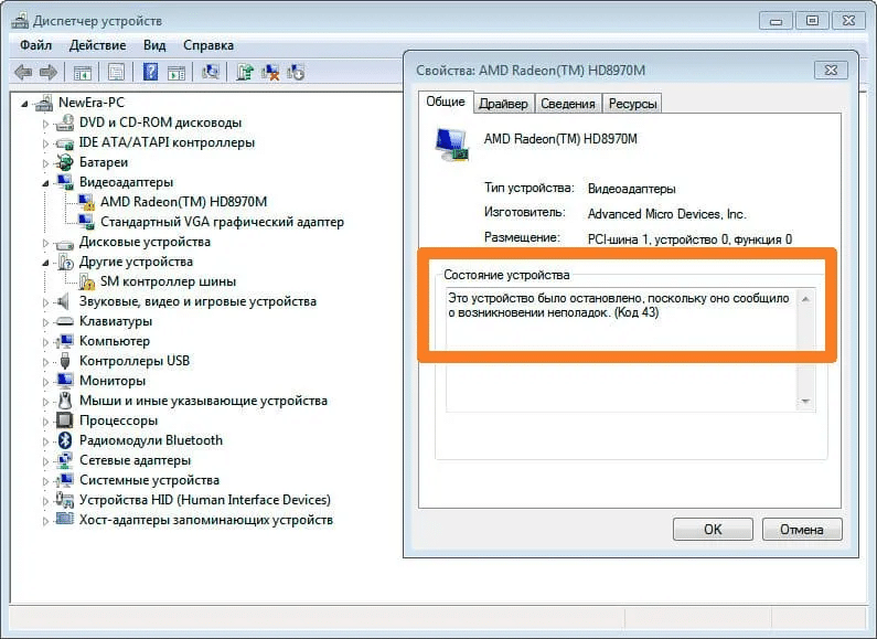 «Система Windows остановила это устройство, так как оно сообщило о возникновении неполадок (Код 43)» – значит, операционная система распознала сбой в работе устройства или его драйвера.