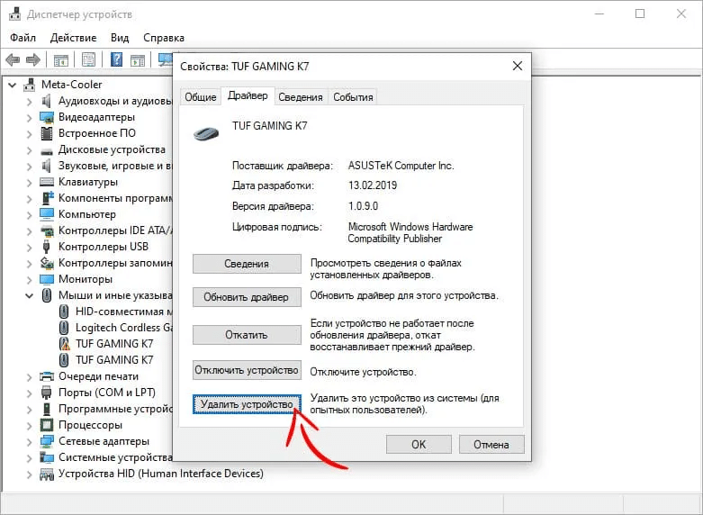 В Диспетчере устройств щелкните правой кнопкой мыши по устройству и выберите Удалить устройство.
