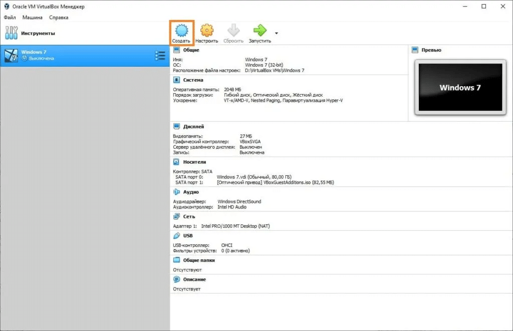 - Откройте VirtualBox и нажмите кнопку «Создать».