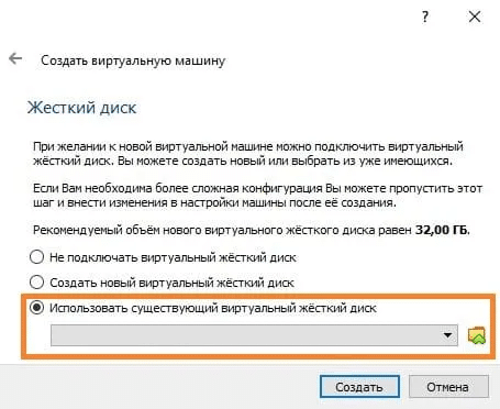 - В разделе Жесткий диск выберите «Использовать существующий виртуальный диск» и укажите созданный VHD.