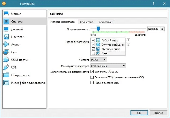 - В настройках VirtualBox перейдите в «Система» → «Материнская плата».