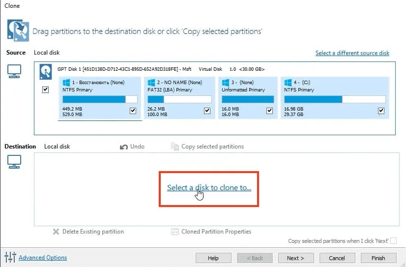 - Укажите новый диск, на который будут перенесены данные. Учтите, что его содержимое будет удалено.