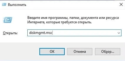 - Откройте инструмент управления дисками, нажав Win + R, введите diskmgmt.msc и подтвердите Enter.