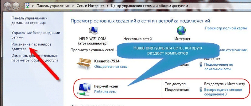 2. Перейдите в «Изменение параметров адаптера» и найдите созданную виртуальную сеть.