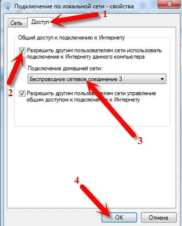 3. Щёлкните правой кнопкой по вашему основному интернет-подключению, выберите «Свойства» → «Доступ» и поставьте галочку «Разрешить другим пользователям…». В списке выберите вашу виртуальную сеть.