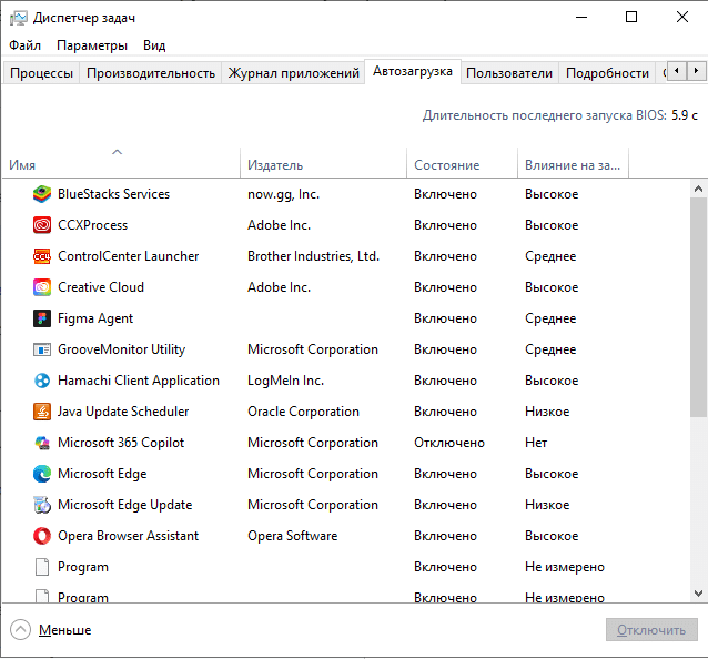 Во вкладке «Автозагрузка» обратите внимание на столбец «Состояние». Если написано «Включено», значит программа запускается вместе с ПК. Отключите приложения, которые вам не нужны. Для этого кликните правой кнопкой мыши и нажмите «Отключить».