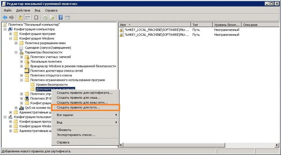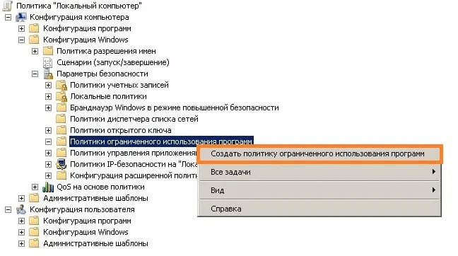 Если при открытии данного раздела в правой части окна ничего нет, щёлкните правой кнопкой мыши по названию раздела и выберите пункт «Создать политику ограниченного использования программ».